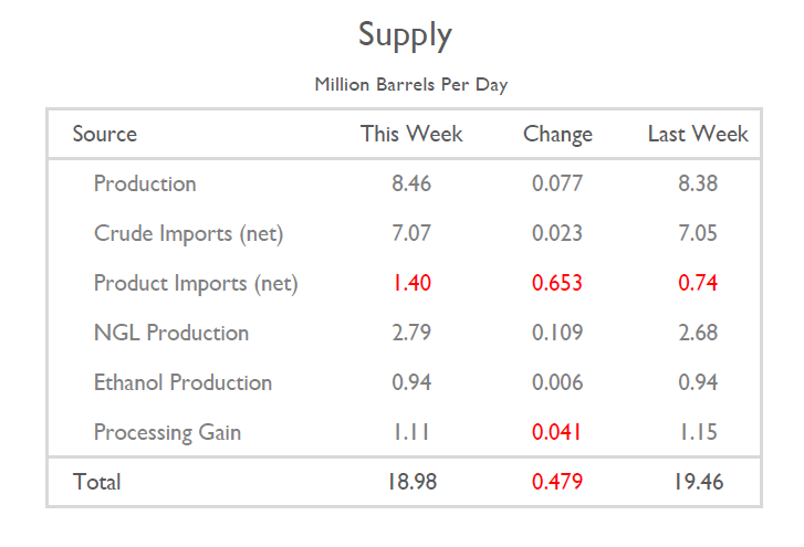 Supply recovered from last week's maintenance-driven decline. Net imports were down on the week, driven primarily by increased product exports.